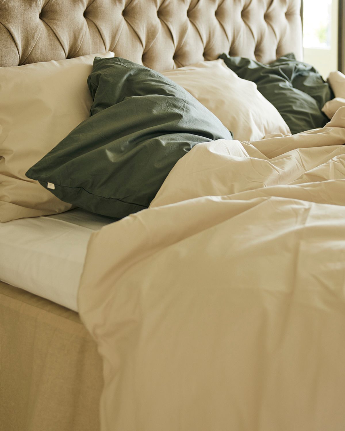 100% ekologisk, percalevÀvd bomull. Ger en krispigt sval och luftig kÀnsla mot huden. GOTS & Oeko-TexŸ Standard 100, klass 1